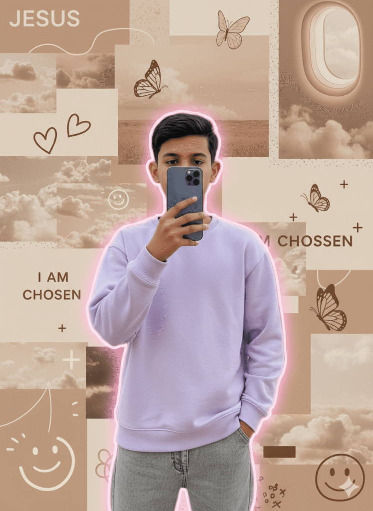 “Create an aesthetic portrait of a young boy posing with his phone in front of his face. He is standing in a relaxed pose with one hand in his pocket. He is wearing an oversized pastel-purple sweatshirt and loose-fit faded grey pants. Add a soft neon pink outline glow around the boy to make him stand out from the background.