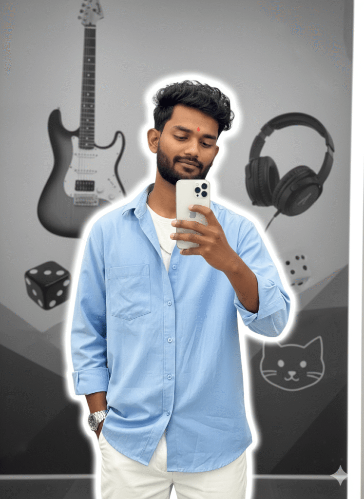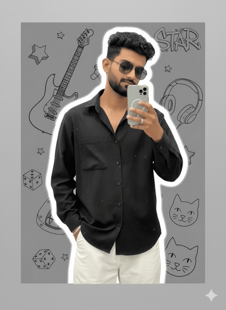 A, stylish young man taking a mirror selfie, wearing a black loose shirt and white pants, holding the shirt casually with one hand, minimal jewelry, curly hair, realistic lighting, and soft white outline glow around him. The background is a modern grayscale aesthetic collage with elements like electric guitar, headphones, dice, cat face decor, 3D stars, and “STAR”graffiti text. Artistic, trendy, Instagram-style edit with balanced composition and HD quality, same