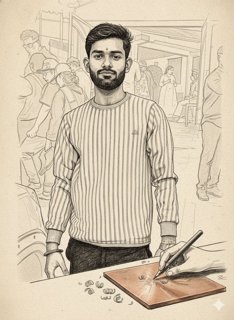 Prompt Old-world engraving style portrait – a near-perfect likeness of the young man from the reference photo, rendered as a vintage copperplate etching in black and white. Dense cross-hatching, parallel line shading, and ornate stippling define the facial planes and hair. A refined right hand with slender fingers rests on an engraving tool above the plate, with tiny metal shavings scattered nearby.