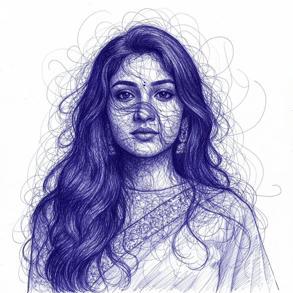 “Create a hand-drawn colored-pencil illustration of an elegant young woman wearing a traditional Indian outfit. She is dressed in a beautifully detailed lehenga or saree with intricate embroidery, floral patterns, and delicate borders. She has long, wavy dark brown hair falling over her shoulders, and she is adorned with traditional jewelry—earrings, necklace, bangles, and a small forehead ornament. The expression on her face is soft, graceful, and slightly looking to the side.