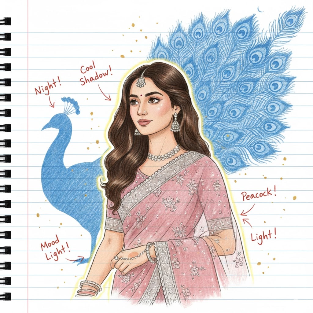 Background should be a notebook page with light blue horizontal lines. Add handwritten red-pencil doodles around, such as arrows pointing to details, words like ‘Night!’, ‘Cool Shadow!’, ‘Peacock!’, and ‘Mood Light!’. Add small sparkly golden particles scattered across the scene for a magical mood-light effect.